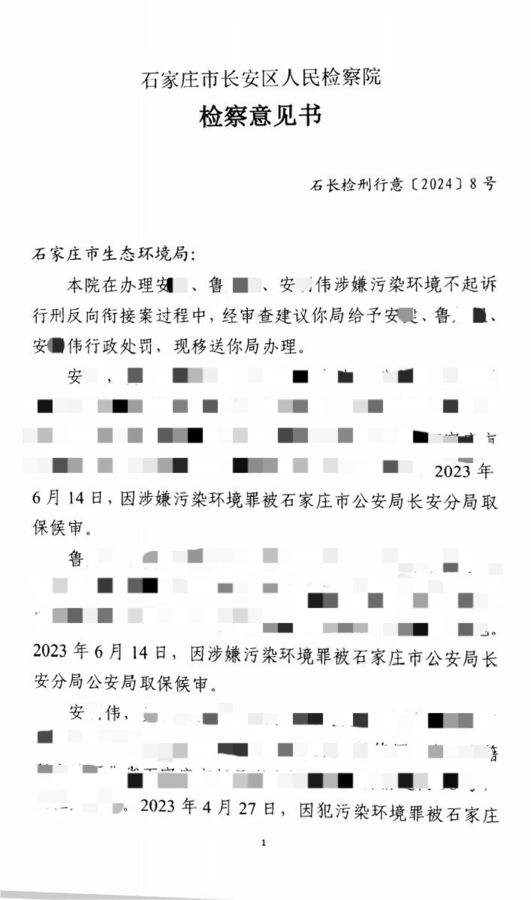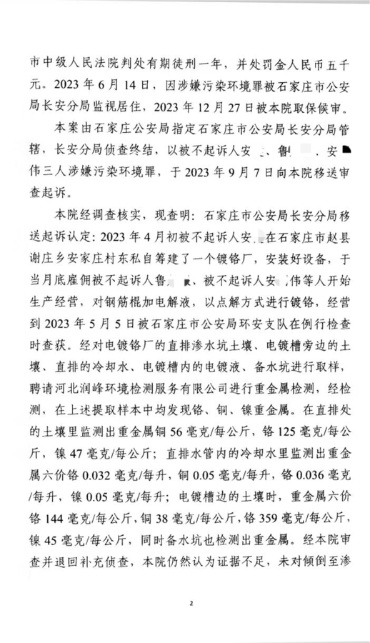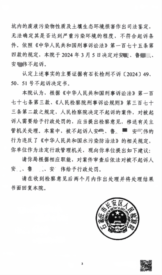 【问题】 2023年5月,石家庄市公安局环安支队例行检查时发现,安某在赵县安家庄村东私建一个镀铬厂,雇佣鲁某某、安某伟等人镀铬,通过渗水坑直排污水,经检测,发现铬、铜、镍重金属,后移送检察院审查起诉。检察院认为未对倾倒至渗坑的废液污染物性质及土壤生态环境损害作出司法鉴定,无法确定其是否达到严重污染环境的程度,不符合起诉条件,不起诉。但检察院认为该三人的行为违反了水污染防治法的相关规定,建议对案件审查后依法对被不起诉人安某、鲁某某、安某伟给予行政处罚。当前镀铬厂已经被取缔,此案应当如何处理?